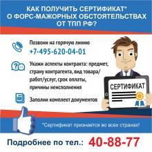 ТПП России выдает сертификаты о форс-мажорных обстоятельствах по внешнеторговым контрактам субъектам предпринимательской деятельности.