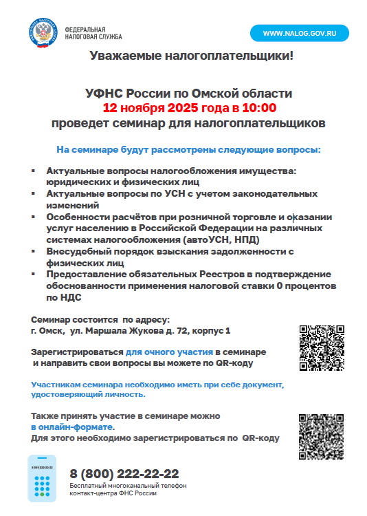 УФНС России по Омской области 12 ноября 2025 года в 10:00 проведет семинар для налогоплательщиков